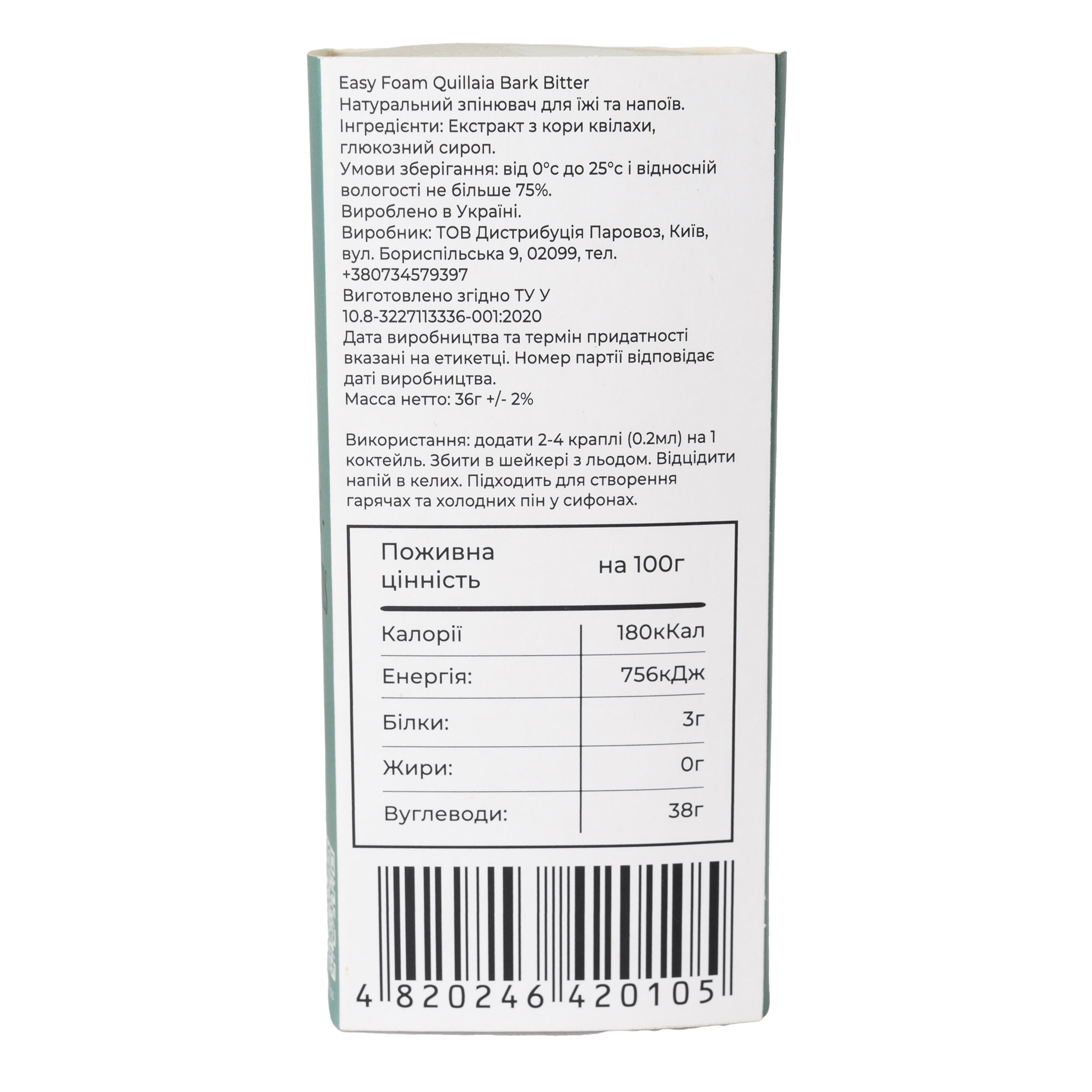 Easy Foam Quillaja Bark Bitter – альтернатива використанню яєчного білка для приготування коктейлів з пишною, щільною і глянцевою пінкою. В основі Easyfoam – натуральний екстракт з кори вічнозеленого Квіллайа Сапонарія. Рослина багата сапонінами, поверхнево-активними речовинами, які і утворюють піну з самого коктейлю. Сапоніни містяться в багатьох рослинах і продуктах, які активно використовуються в харчовій промисловості, фармацевтиці та парфумерії. Easyfoam не містить алкоголю і глютену, підходить для веганів.