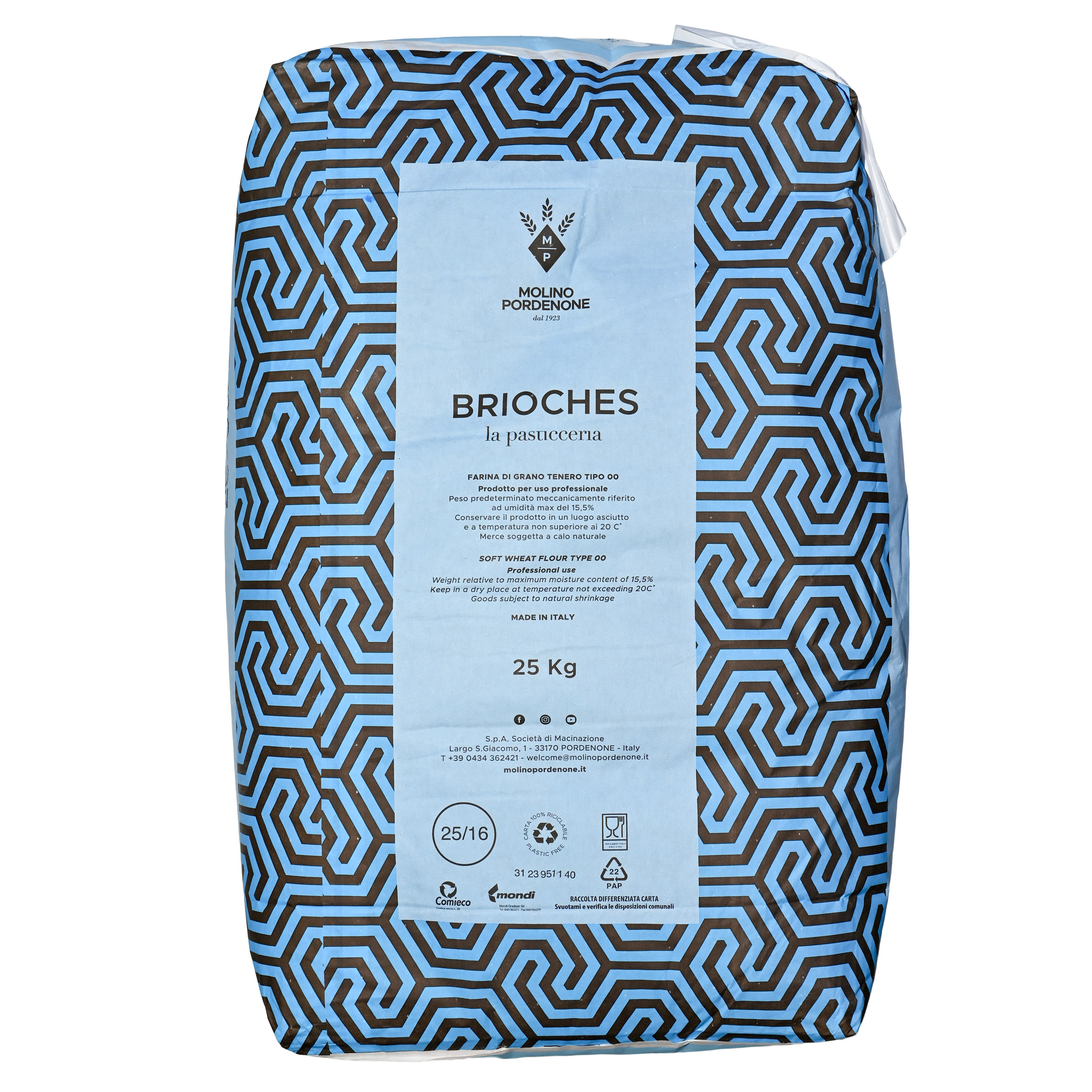 "Brioche" Linea Pasticceria - професійне кондитерське борошно, що ідеально підходить для виробництва бріоші, випічки з листкового тіста з більшим вмістом жирів (масла), заморожених круасанів і ромової баби. Завдяки особливій структурі білка це борошно для кондитерки дуже добре переносить додавання жиру. Кінцевий продукт має гарний світлий колір з чудовим розвитком, зберігаючи потрібну м’якість. Навіть при глибокому заморожуванні зберігає органолептичні характеристики продукту без змін.