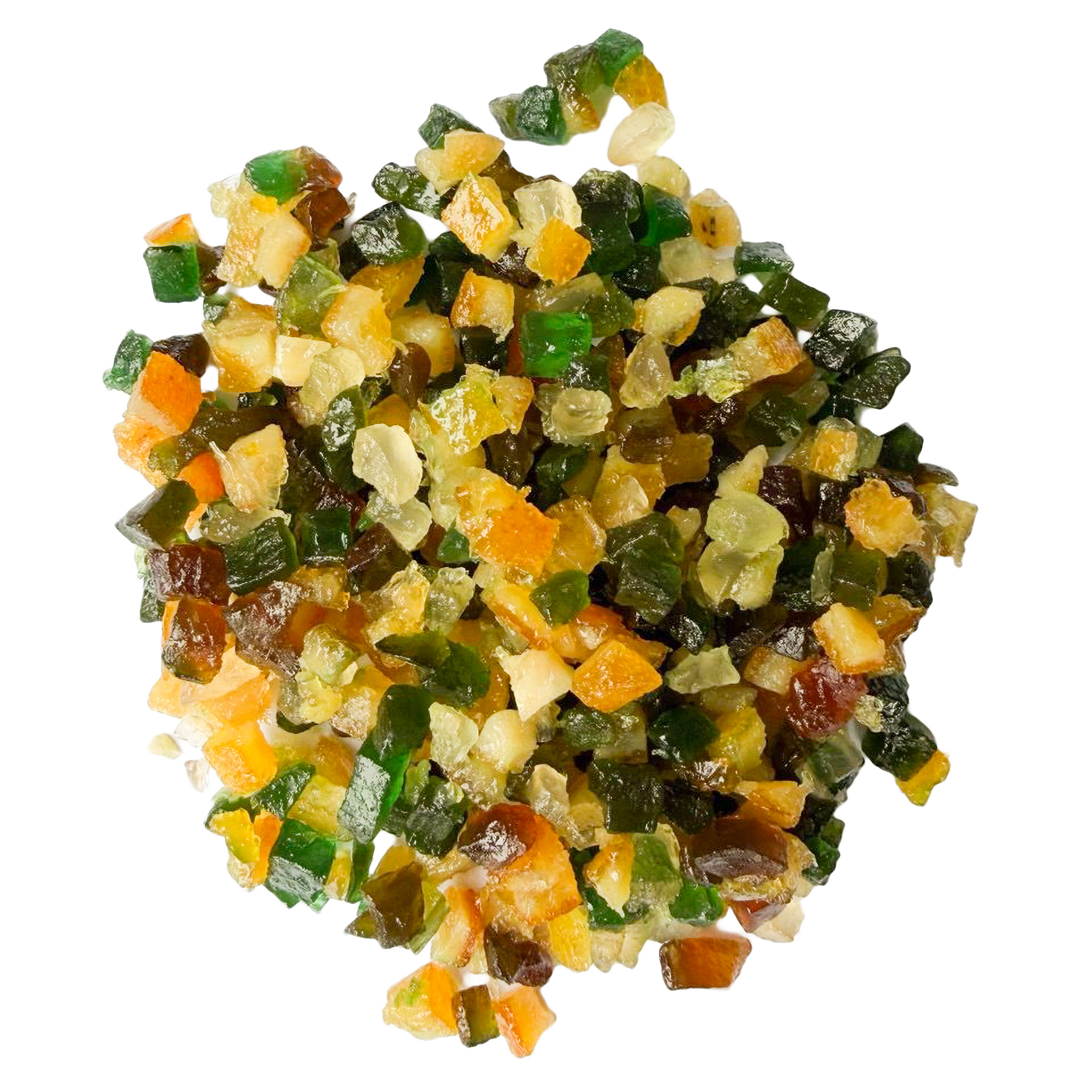 Тонко нарезанные и откалиброванные фруктовые кубики размером 6 × 6 мм станут незаменимым дополнением в выпечке, тортовых начинках, десертах и декоративных элементах. Благодаря плотной консистенции без видимой кристаллизации и ярким цветам (красный, оранжевый, зеленый) они придают изделиям не только вкус, но и привлекательный внешний вид.
