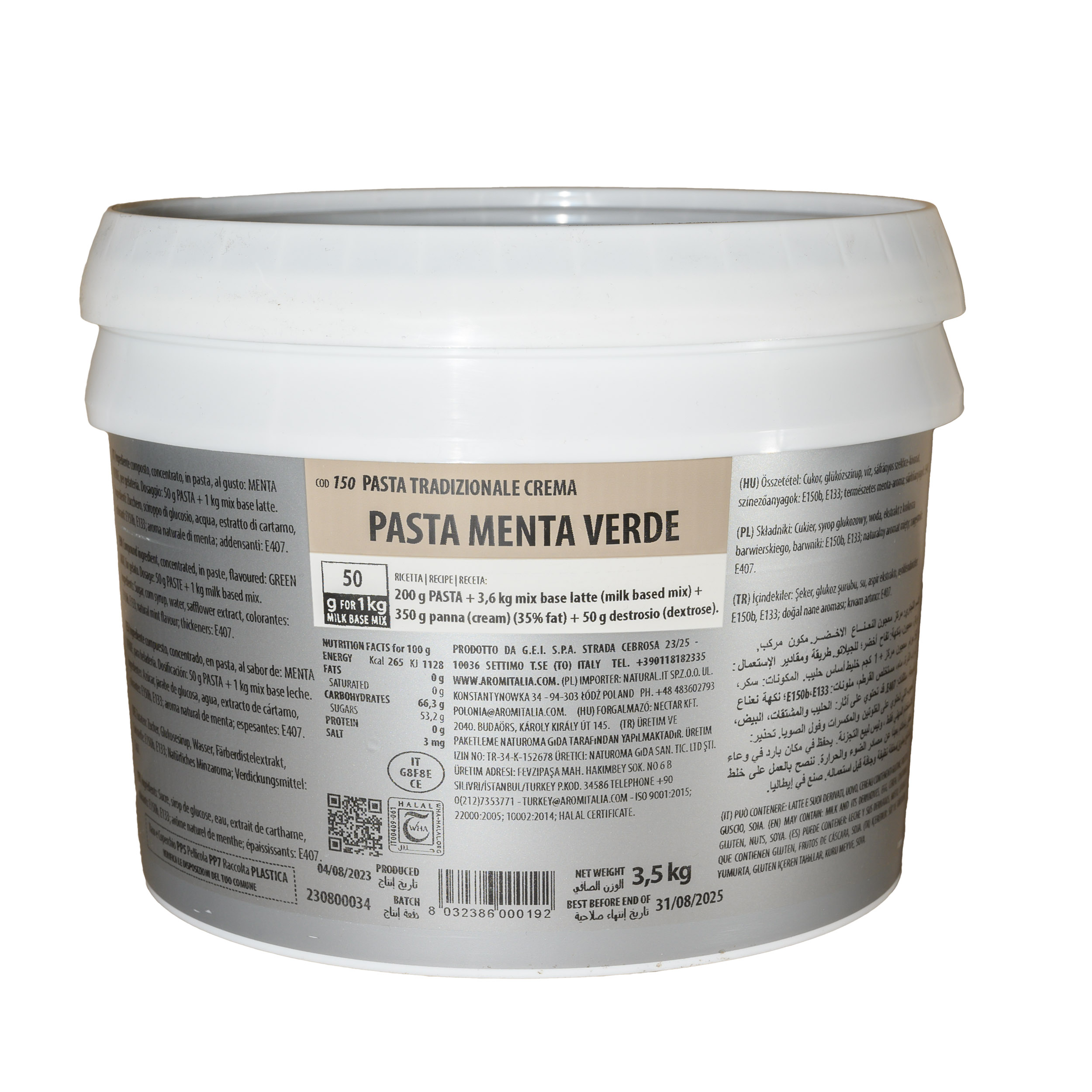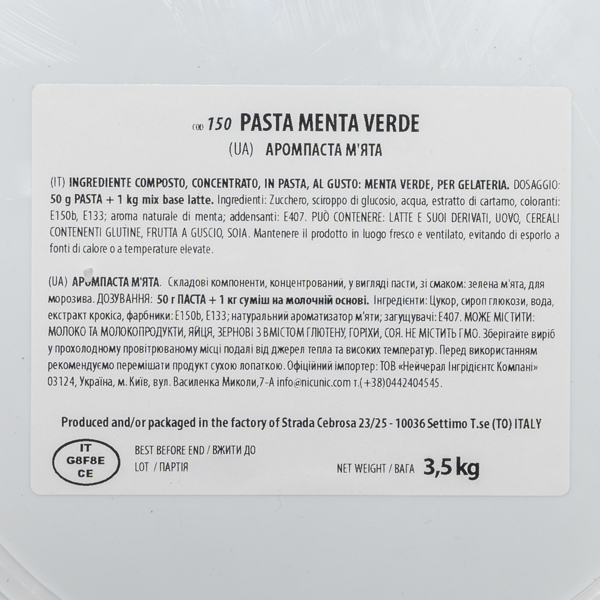 Свежий и натуральный вкус мяты и ярко-зеленый цвет ее листьев сосредоточены в этой вкусовой пасте. Имеет натуральный и мятный и вкус идеально подходит в сочетании и с добавлением хлопьев черного или белого шоколада.